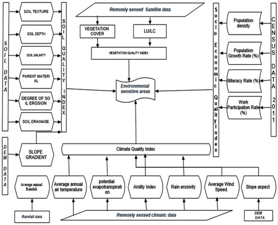 The methodology for assessing environmentally sensitive areas is based on the MEDALUS model, developed by the European Commission [43]. Our study has developed 19 indicators of desertification using layers derived from satellite data as well as from other available sources. All four indices, soil quality index (SQI), climate quality index (CQI), vegetation quality index (VQI), and socio-economic quality index (SEQI), were integrated to calculate a single index called environmental sensitive areas to desertification index (ESAI) using Formula (7).