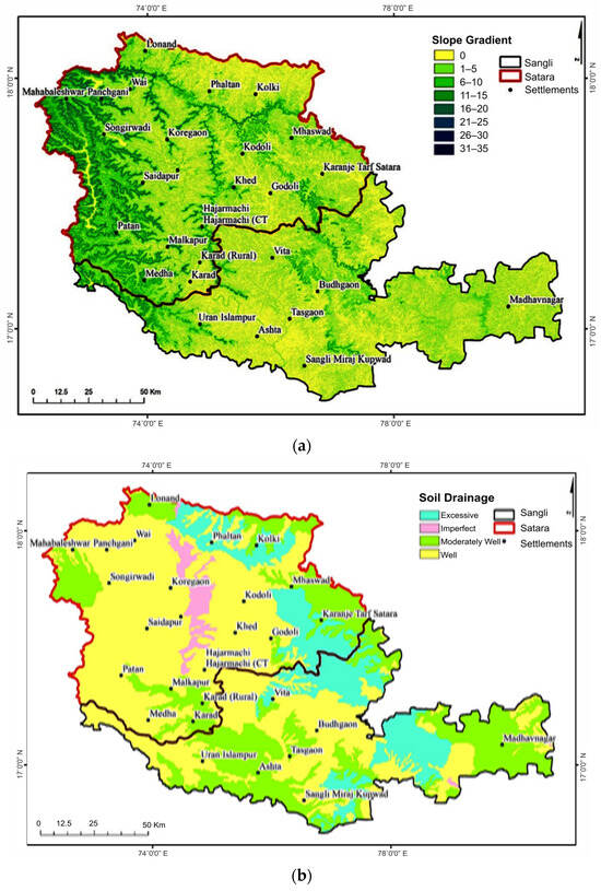 Slope gradient in degree (a) and soil drainage (b) maps.