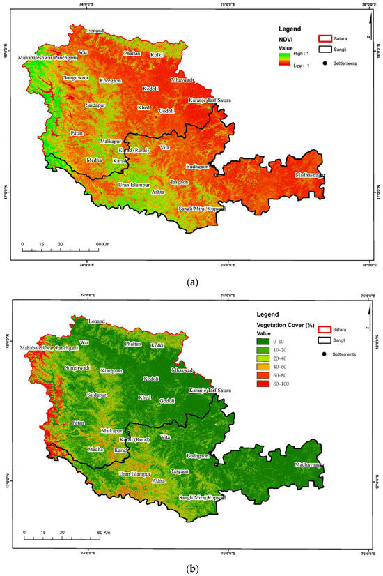 The NDVI is usually sensitive to vegetation. However, the identification of vegetated and non-vegetated areas is performed by LULC data, as NDVI alone may not accurately distinguish between the two. In the study area, categories identified in LULC data like cropland, deciduous forest, and degraded forest were considered as vegetated areas, and other categories as non-vegetated areas. Areas that have barren rock, sand, or snow usually have very low NDVI values, typically 0.1 or less. Sparse vegetation such as shrubs, grasslands, or senescing crops may result in moderate NDVI values, approximately 0.2 to 0.5. On the other hand, high NDVI values, approximately 0.6 to 0.9, correspond to dense vegetation such as that found in temperate and tropical forests or crops at their peak growth stage. In the study area, high NDVI values were found in some parts of the Satara district, whereas the majority of the study area represents sparse to very sparse vegetation (Figure 7a). The vegetation cover map showed that the western part of the study area is mostly dominated by forest cover (Figure 7b). It is considered an important parameter to deduce VQI.