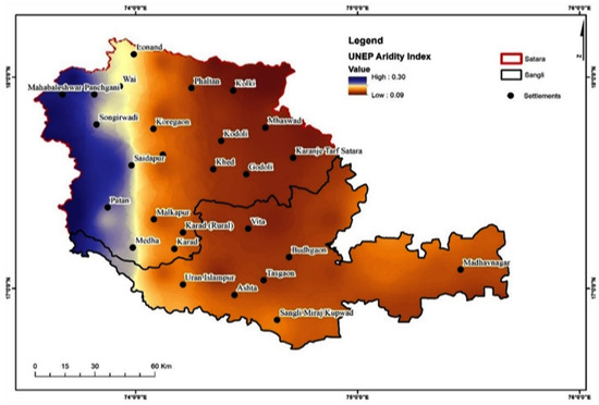 The aridity index reflects the relationship between climate and water availability. A higher aridity index means higher water scarcity and variability, making areas more vulnerable to desertification over time [50]. It was found that PET is more in Satara and hence the aridity index is also higher in Satara in comparison to the Sangli district (Figure 9). In both arid and semi-arid regions, if there is an increase in wind speed above the critical limit, it will lead to both land degradation and desertification [16,51]. The average wind speed for March to June of 2019 was calculated which varies from 1 to 2 m per second (Figure S8). The western side of the study area showed higher wind speed (>1.7 m/s) and hence vulnerable to desertification.