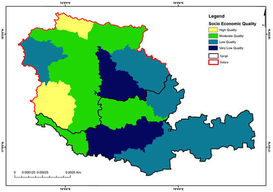 The parameters used to evaluate socio-economic quality, their classes and their assigned weightage are described in Supplementary Table S4. Block-wise data from the Census of India, https://data.gov.in (accessed on 21 April 2020), for the year 2011 were used to evaluate the socio-economic quality parameters. Block-wise population density (PD), block-wise population growth rate (% per year) (PG), block-wise illiteracy rate (%) (I), block-wise work participation rate (%) (WP) were calculated by dividing the total population of villages for year 2011 by its area. SEQI was calculated using Equation (6).