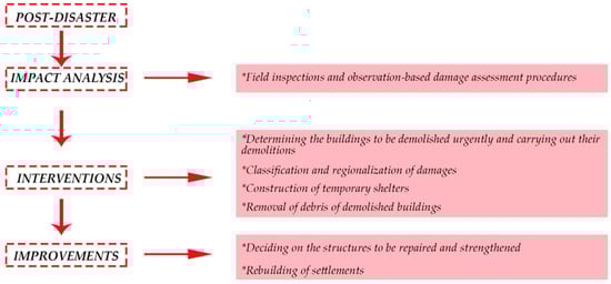 As in different parts of the world, post-earthquake site investigations in Türkiye, the precautions that can be taken because of these investigations, and the reasons why the earthquake performance of the buildings was not sufficient have come to the fore. Studies carried out after the earthquake are an important part of post-disaster management. The post-disaster operations in terms of structural and earthquake engineering are briefly summarized in Figure 1.