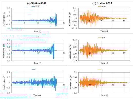 Acceleration–time graph: (a) 0201 Station (Mw = 7.7 Pazarcık Earthquake) and (b) 0213 Station (Mw = 7.6 Elbistan Earthquake).