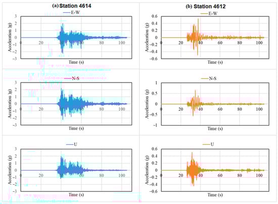 Acceleration–time graph: (a) 4614 Station (Mw = 7.7 Pazarcık Earthquake) and (b) 4612 Station (Mw = 7.6 Elbistan Earthquake).