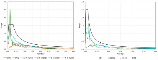 The response spectrum curves obtained by taking a 2% damping ratio for the 0201 and 0213 stations with the highest acceleration values in Adıyaman province of the two earthquakes with Pazarcık and Elbistan epicenters are given in Figure 6. As seen from the curves, the Spectral acceleration values measured in the earthquake, whose epicenter was Pazarcık, exceeded the DD-1 and DD-2 design ground motion levels, and in the vertical direction, only the DD-2 design ground motion level was exceeded. DD-1 indicates the ground motion level with a repetition period of 2475 years and a 2% probability of exceedance in 50 years. DD-2 indicates the standard ground motion level with a repetition period of 475 years.