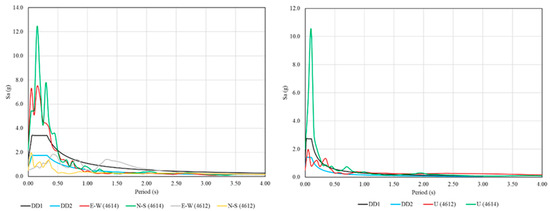 The response spectrum curves obtained by taking a 2% damping ratio for stations 4614 and 4612, which have the highest acceleration values of two separate earthquakes in Kahramanmaraş province, are given in Figure 7. As seen from the curves, in the Pazarcık-centered earthquake, both horizontal and vertical values exceeded the DD-1 and DD-2 design ground motion levels.