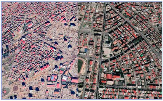 Aerial views before the earthquake and aerial views of the destruction caused by the earthquakes in the Kahramanmaraş and Adıyaman provinces, where more than 350,000 buildings were affected by the earthquake, are shown in Figure 8 and Figure 9, respectively.