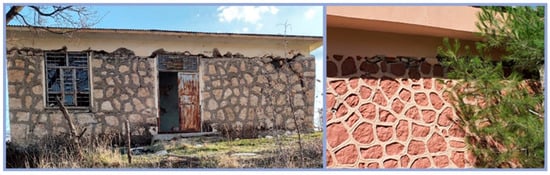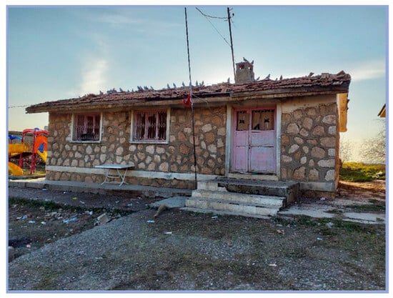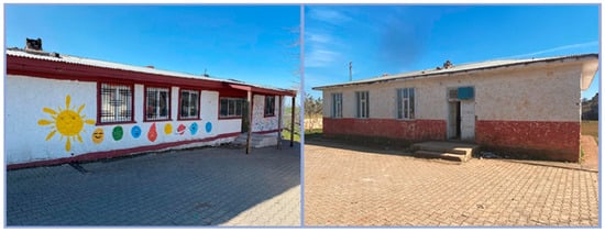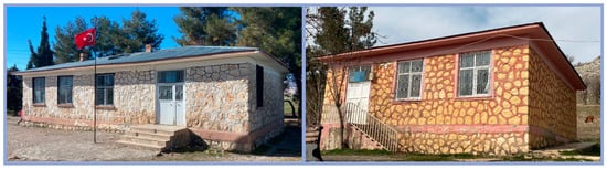 In these masonry school buildings, the load-bearing wall materials have high compressive strength and very low tensile strength identical to other types of masonry structures. While these walls can show sufficient strength under the influence of large pressure forces, they cannot show sufficient resistance against bending and shear forces. These components are susceptible to bending and shear stresses in this situation since they may be subjected to high-pressure forces [53,54,55,56,57,58] Damage levels in masonry structures may vary due to the large pressure forces that occur based on the magnitude of the earthquake. Examples of single-story schools that were built in rural areas affected by the Kahramanmaraş earthquakes and were not damaged at all are shown in Figure 13.