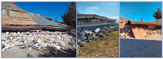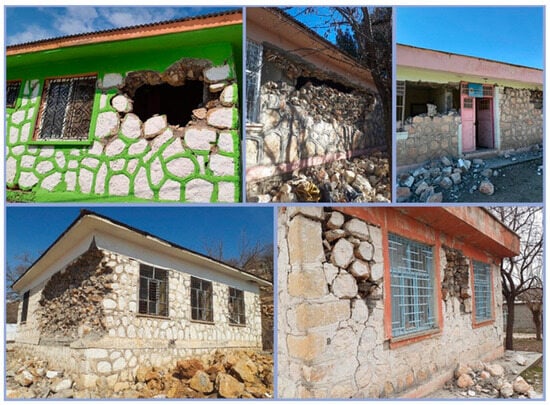 Near the epicenter of the earthquake, most of the masonry buildings had either completely collapsed or suffered significant damage. The poor load-bearing walls were the main cause of this. In general, neither the unsupported wall length nor the necessary window openings, the length between corners and the closest doors or windows, or the apertures between windows and doors were met by the load-bearing walls of the masonry structures. Examples of school buildings that collapsed completely and became rubble due to the effect of the earthquakes are shown in Figure 14.
