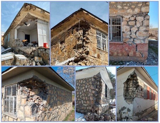 In the formation of the corners of masonry structures, the lack of connection between load-bearing walls in this region causes them to show weak behavior under earthquake loads. This mechanism is usually caused by the absence of a diaphragm provided by the cornerstones that provide adequate connection, preventing wall separation and out-of-plane failure [59]. Examples of such damage occurring at the corners are shown in Figure 16.