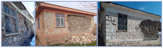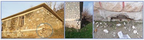 The use of low-strength mortar in the creation of load-bearing walls, poor masonry work, and random use of wall materials have caused different levels of damage to the load-bearing walls. Examples of failure resulting from these situations are shown in Figure 19.
