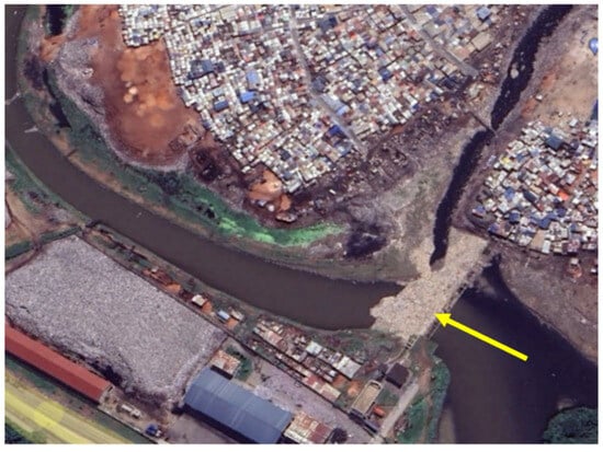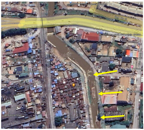 Collapsed concrete walls identified at the yellow arrows along the Odaw River at Achimota, 5°37′13.0 N, 0°13′44.5 W. Date: 6 September 2023. Source: Google Earth Pro.