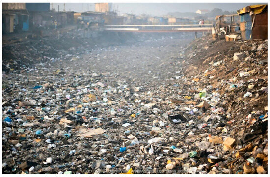 Like many other rapidly growing cities worldwide, Accra, the capital of Ghana, suffers from recurring floods that cause loss of life and costly property damage [1,2,3,4]. Additionally, citizens living in affected areas face severe problems when commuting to and from work, school, or transporting goods through flooded infrastructure [5]. Investigations of climate records for Accra by the authors and [6] show no significant increase in precipitation trends for the Greater Accra Metropolitan Area (GAMA) from 1950 to 2020. Meanwhile, according to [7], observations in Ghana indicate that climate change has considerably shortened the rainy season and increased the intensity of rainfall events, leading to frequent flooding. Another factor contributing to the impacts of floods in the GAMA is the extensive conversion of farmland into urbanized areas and paved infrastructures reducing soil infiltration. This transformation causes substantial increases in surface runoff volumes [8]. In Accra, this results in the undercutting and dislocation of concrete blocks that stabilize the sides of storm drains and river channels, as seen in Figure 1, leading to the local ponding of stormwater. Additionally, indiscriminate littering and trash dumping into the rivers in dry periods waiting for the garbage to be carried away by stormwater has been ongoing for years [9]; see Figure 2 and Figure 3 and Video S1 shared in the Supplemental Materials Section captured in October 2023. Beyond the devastating pollution effects on the marine environment when the waste is carried into the Gulf of Guinea [10], waste-clogging at road overpasses causes massive floods upstream. Moreover, floods occurring near the outlet into the sea at the Korle Lagoon, next to one of the world’s most heavily contaminated industrial areas, worsen pollution in the flooded regions [11].