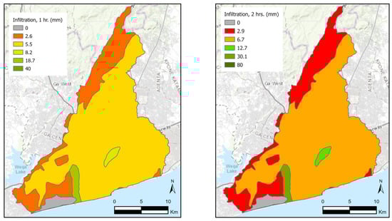 For the modelling of stormwater scenarios, soil infiltration rates corrected for imperviousness were subtracted from each uniform rain event at a local watershed basis to better represent the runoff rain volumes on the ground. Figure 8 shows a map of soil infiltration rates for rainstorms lasting for 1 and 2 h.