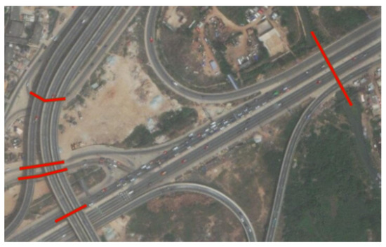 When a DTM is captured, all-terrain levels are registered on top of infrastructures. Therefore, adjustments to the levels for under-passing water, are required. Otherwise, water will stow on the upstream side of the obstacles when water flow is derived from the DTM. To detect such situations, 363 lines were digitized from local visual inspections of Esri’s Basemaps, and an example is shown in Figure 9. The correction principle is illustrated in Figure 10 where adjusted terrain levels are calculated by linear interpolation of levels identified at the endpoints for the hydro-conditioning features assigned to a correction raster. Subsequently, the original DTM cell values are substituted with the values in the correction raster [34].