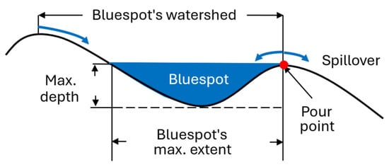 Technically, the individual bluespot’s location in the hydrological hierarchy within a major drainage basin is determined through a topological investigation of the hydrologic network constructed from nodes (representing the bluespots’ characteristics) and edges (downstream lines connecting one pour point to the next). Once defined, the network can be traversed for each rainfall scenario, and the water balance can be saved for each bluespot during any rain event. Therefore, the nodes table contains one row for each bluespot. If multiple rain events are simulated, the information in the nodes table expands with new columns representing the water balance for each rain event. If the modelling includes 13 uniform rain scenarios in the range of 30–150 mm in 10 mm increments, a final traversal of the spillovers for each bluespot reveals the rain event at which a bluespot reaches full capacity and begins to spill over (the filled event). This outcome, along with visual representations of spillover values from each bluespot indicating the water volumes carried downstream from its pour point, constitutes the screening’s primary findings. Furthermore, if bluespots contain such large volumes that they are never filled to their pour point levels in any of the investigated rain events, a post-processing application adjusts the bluespots’ extents and revises their partially filled depths for the rain events under examination. The post-processing principle can be explored in [37].