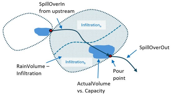 A section through a local bluespot and its local contributing watershed. When the water level exceeds the pour point’s elevation level, the excess spillover (SpillOverOut) is transported downstream to the next bluespot’s watershed as incoming spillover (SpillOverIn from upstream, Figure 14).