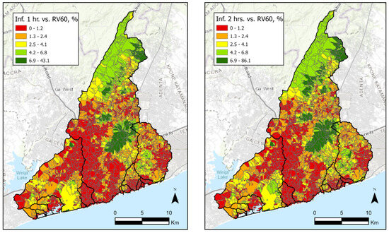 From the analysis of rainfall distributions and due to the lack of rainfall data for the Weija and Accra Academy, it was decided not to move forward with investigating distributed rain events. Instead, uniform events were added to all drainage basins in the range of 30–150 mm. Each scenario was modelled including infiltration rates for rain events lasting 1 and 2 h separately, incorporating infiltration rates derived from combinations of soil types and land cover classes presented in Section 4.1. Such screenings provide unbiased overviews of worst-case flood scenarios from the DHyM presented in Section 3.3.