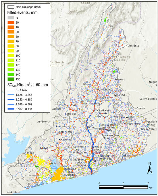 For the major drainage basin, only a few large bluespots with very high capacities are found in the northernmost region at the Akwapim Mountains. However, runoff entering Abokobi is mainly generated along the downstream mountainsides. Around 2.3 km south of Abokobi, a major river branch collects runoff from the entire north-northeastern part of the Odaw River basin at Aburi, Amrahia, Adentan, Madina, and Western Legon. The spillover volumes are moderate until Haatso near Western Legon as much runoff is retained in bluespots along the river corridor. Meanwhile, another runoff branch enters from Tantra Hills. When the two river systems merge at Achimota, West Legon, the runoff significantly increases. This is documented in [16], and locations southward from there along the river face immense flood risks, not least because the runoff from the surroundings increases significantly where the river system enters the densely built-up areas in the GAMA causing a drastic reduction in soil infiltration rates compared to precipitation.