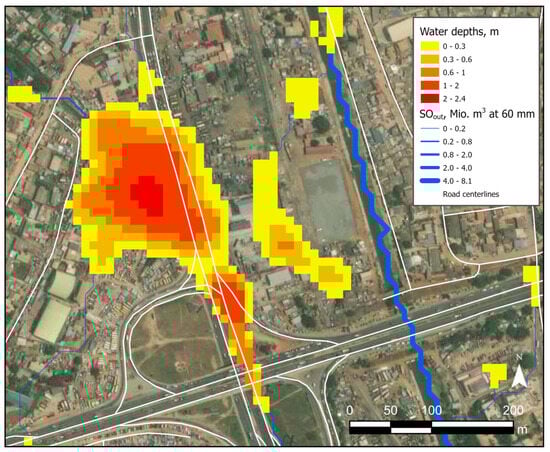 Although most high-risk flood locations are found along the main river system south of Achimota, many villages in the entire drainage basin suffer during extreme rainfalls. Infrastructure also suffers when located along river corridors, as well as where roads are constructed without considering their location in the hydrologic setting, blocking traffic. For instance, a well-known local bluespot along a major road artery is located at Achimota as shown in Figure 18. Upon examining the outcomes of this scenario, a trouble bluespot, when filled to its maximum capacity at just a 30 mm rain event, reaches a depth of 50–160 cm in both driving directions along a 150 m long highway segment. Once filled, it becomes a complete roadblock as typical vehicles cannot navigate water depths exceeding 30 cm, preventing most cars from passing through before water enters the cabin [39]. Consequently, this roadblock significantly impacts the daily commute of individuals, the transportation of goods, and more. Based on rainfall data for Accra Airport from 2010 to 2018, rain events equal to or greater than 30 mm per day occurred an average of seven times a year. Even smaller rain events lead to roadblocks (at least for southbound traffic) when the lowest-lying sections of the bluespot intersecting the highway become inundated.