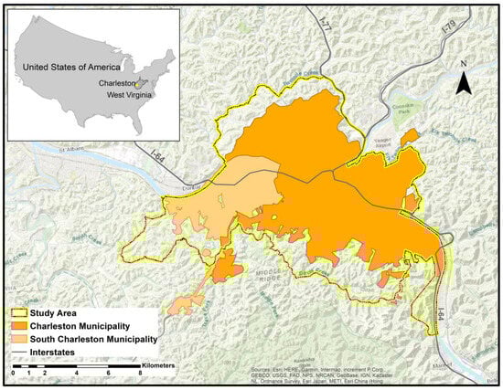 Charleston is the capital city of West Virginia and the largest city in the state. The last severe flood in the city dates back to 2003 [28]; however, with more than three km2 (360 hectares) of developed floodplains, Charleston is at a high risk of flooding [29]. According to the WV Flood Tool created by the West Virginia GIS Technical Center (WVGISTC), about 1700 primary buildings are in the city’s high-risk flood zones [29]. The city is located in the west–central part of Kanawha County at the intersection of interstate highways I-79, I-77, and I-64. Compared to Houston, Charleston has a much lower diversity with 75% white people, 15% African Americans, 3% Asians, less than 1% American Indians or other Natives, 1% of other races, and 6% of two or more mixed races according to the 2020 decennial census [26]. South Charleston is a separate municipality to the west of Charleston. The city covers an area of roughly 22 km2. Its population is 13,647 based on the census results of 2020. In terms of the physiographic provinces, the area belongs to the mountainous region of the Appalachian Plateaus. For definition of the study area, we considered the census tracts that were entirely in the cities in addition to those partially intersecting the above areas, of which most developed areas were within the city limits. We defined an area of 146 km2 as the above study area (Figure 2). The population of the region is 62,840 based on the 2019 ACS [26].