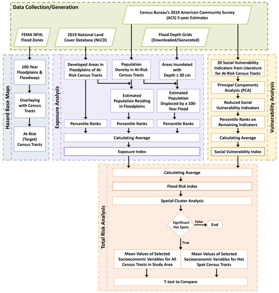 In recent decades, there has been a shift from conventional policies focused on flood hazard protection to risk mitigation plans [11]. More comprehensive flood risk analyses are required for efficient mitigation, preparedness, and response to future floods [9,10]. Analyses of flood risk distribution identifying the significant clusters of exposure, vulnerability, or their combination can highlight the locations with higher potential of human losses or physical damages as the main focus of mitigation plans [4,21]. Although many researchers have discussed the concept of flood risk as a function of the above elements, a few recent experimental efforts, such as [7,8], included the spatial patterns of flood risk, covering its components. To fill this need, the goal of this study was to test this hypothesis for the study areas: Do high flood risk clusters exist in urban communities where socioeconomically disadvantaged people reside? We investigated the magnitude of the population and the developed land prone to flooding in addition to their level of vulnerability in the census tracts as communities. We employed geospatial technologies as the primary tools to spatially analyze the data. After quantifying the exposure and social vulnerability, deciding the most significant factors in each city, we studied the spatial patterns of flood risk in the study areas. We used appropriate spatial statistics techniques to identify and map the significant hot spots or clusters of high risk. Flood risk and vulnerability maps can display communities’ degree of susceptibility and risk more appropriately if combined with flood indices [22]. An objective of this study included the production of flood indices.