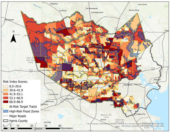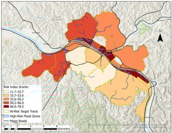 This study stage combined the explained indicators of flood hazard, exposure, and vulnerability in the study areas to introduce the most at-risk communities. The exposure data resulted from overlaying the population and developed lands with the flood zones. Consequently, they already included both exposure and hazard aspects of the risk. The approach integrated the exposure and vulnerability data by combining the indices. The flood risk index was created, averaging each tract’s exposure and vulnerability scores. Accordingly, the final scores were between zero to 100. The tracts with higher scores could be considered as more at-risk of flooding (Equation (3)).