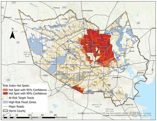 The flood risk index combining the exposure and vulnerability indices assigned scores between 8.6 to 86.9 to the target census tracts in the Houston area (Figure 7). With at least 95% of confidence, we could map two urban areas in the north–central and southwest parts as the hot spots of flood risk in the city (Figure 8). Based on our results, those areas are the clusters of census tracts with high, if not necessarily the highest, values of the risk index located near each other.