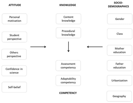 Research framework. It conceptualizes the hypothesis that knowledge may positively affect students’ competencies, and that attitudes and socio-demographic features influence these core literacy variables.