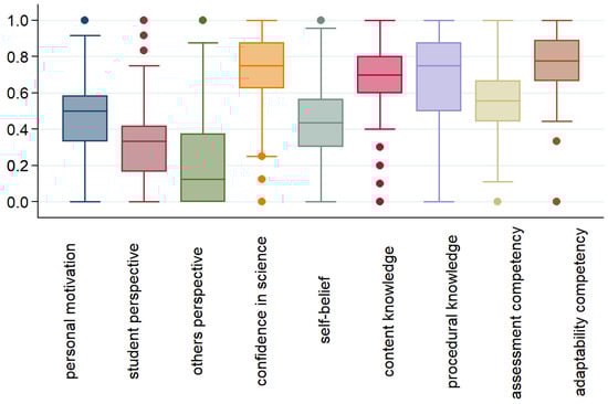 Box plots of the attitude, knowledge, and competency variables. Normalized measures at a 0–1 range are shown.