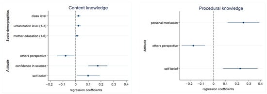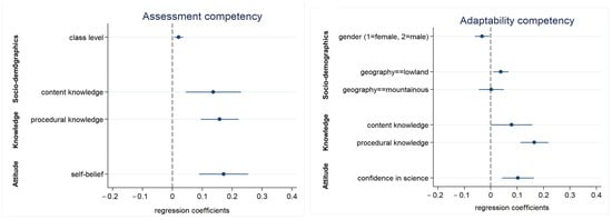 Regression results are displayed graphically in Figure 3 and Figure 4 to help interpret and compare the effects on the dependent variables. According to the model results, knowledge significantly affects the level of competencies. Both assessment competency and adaptability competency were found to be positively affected by content knowledge (0.14, p < 0.01 and 0.08, p < 0.05, respectively) and especially by procedural knowledge (0.16, p < 0.001 and 0.16, p < 0.001, respectively). Among the variables of attitude, self-belief was found to have a significant positive effect on assessment competency (0.17, p < 0.001), and confidence in science was found to have a significant positive effect on adaptability competency (0.10, p < 0.001).