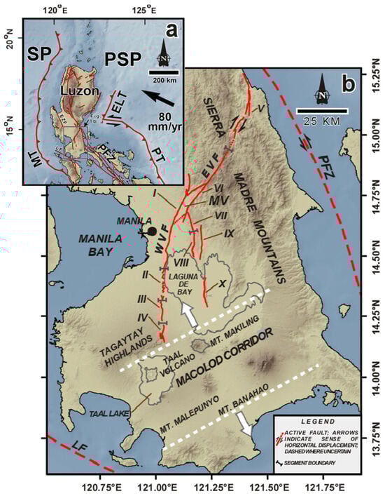 The creeping zone corresponds to a segment (Sucat–Biñan or segment II []) of the Valley Fault System (VFS) or Marikina Valley Fault System (MVFS) on the southeastern part of Metro Manila. The VFS belongs to a system of faults and subduction zones that accommodates part of the deformation in central Luzon due to the northwestward drift of the Philippine Sea Plate (PSP) towards the Sunda Plate (SP). (a) The VFS region is bounded by the Philippine fault zone (PFZ) on the east, the East Zambales Fault (EZF) on the west, and the Lubang Fault (LF) on the south. Also shown are the East Luzon Trough (ELT) and the Philippine Trench (PT) to the east and the Manila Trench to the west. Direction and rate of PSP motion after Seno et al. []. The active faults are from the Philippine Institute of Volcanology and Seismology [], Rimando [], Rimando and Knuepfer [], and references therein. (b) The VFS extends for 135 km from the Sierra Madre to the eastern part of the Tagaytay Ridge. White dashed lines indicate approximate boundaries of the zone of volcanoes (Macolod Corridor) to the south of the VFS. White solid arrows indicate direction of extension within the Macolod Corridor. The northern part of the Marikina Valley (MV) is a pull-apart basin formed within the gap between the two major segments of the VFS (the West Valley Fault, or WVF, and the East Valley Fault, or EVF). The minor structural/geometric segments of the VFS are indicated by Roman numerals I to X. The creeping segment corresponds to segment II. Segmentation after Rimando [] and Rimando and Knuepfer [].