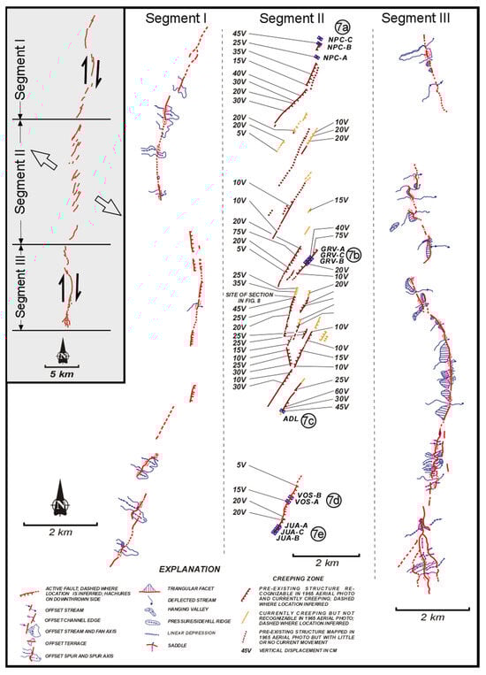 The recognition of morphotectonic features and displaced landforms and streams had been instrumental in mapping the active traces of the VFS [,]. As Figure 2 and Figure 4 show, scarps are the dominant geomorphic features within the creeping zone, which lies between segments I and III. The occurrence of creep was first reported during the initial stages of neotectonic mapping of the WVF in the early 1990s. The recognition of fresh creep scarps occurring on old scarps within the creeping zone, which were assumed to be of tectonic origin, greatly facilitated the mapping of the creeping zone (as segment II) and the continuity between segments I and III.