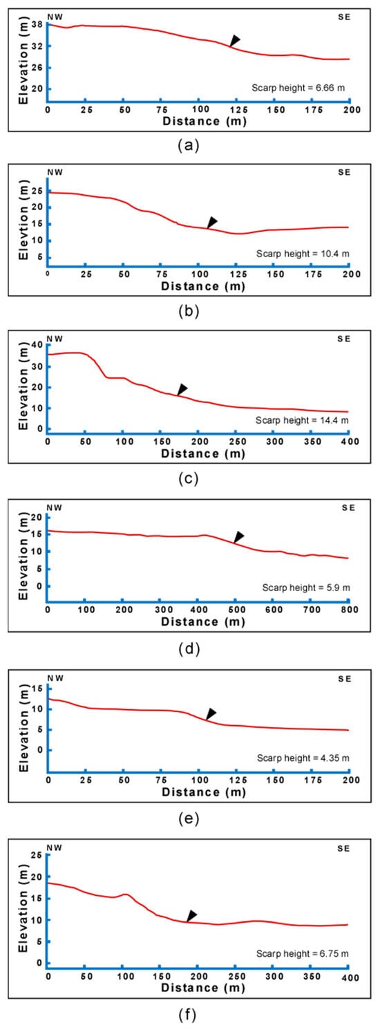 Profiles drawn perpendicular to the segments on the western part of the WVF’s creeping zone (segment II). The arrows indicate the location of the scarps due to the current creep. The locations of the profiles (a–f) are indicated in Figure 2a. Scarp height estimates are indicated.