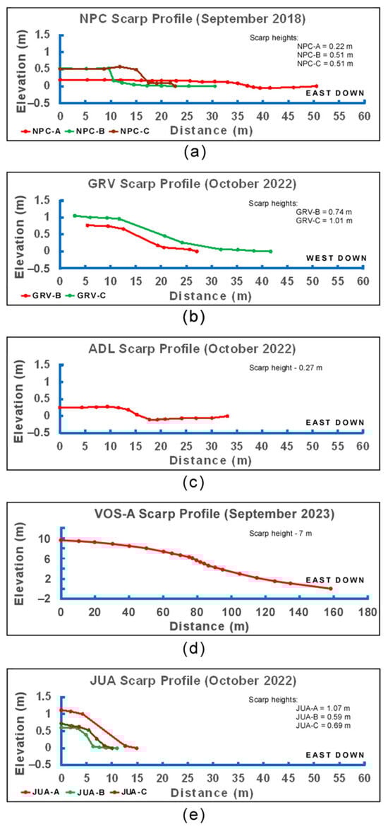refer to the locations of scarp profiles used for height estimation. NPC, GRV, ADL, VOS, and JUA refer to deformation survey sites where displacements have been regularly measured (2–3 times/yr) since 1999. Slip rates derived from displacement measurement at these sites are in Figure 3. Source of geology: Bureau of Mines and Geosciences [].