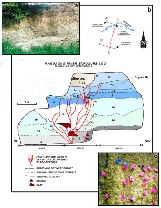 As creep may occur along pre-existing scarps that are nontectonic in origin, paleoseismic mapping was employed to verify whether tectonic faulting preceded and played a role in localizing creep. The highly urbanized nature of the creeping zone poses tremendous challenges in identifying trenching sites. An exposure along a river cut by one of the creeping faults in Muntinlupa City (Figure 8a; location in Figure 2a and Figure 4) provided an opportunity for mapping fault strands and offset sedimentary units without excavating.