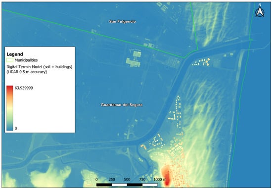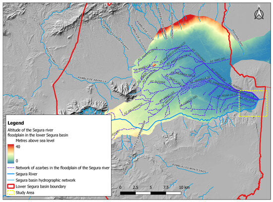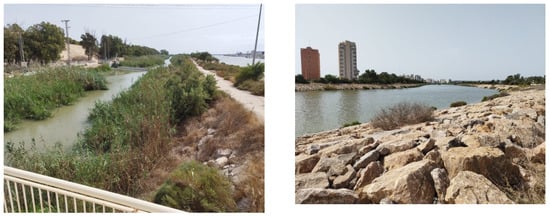 Second, the altitude of the river valley, with respect to the sea level, is very low. In half of the valley, there are altitudes of 10 msnm and in the area of study between 2 and 0.40 m. This means that the average slope on the left bank of the River Segura is very slight (0.05%), so the flood waters circulate very slowly, hindering their drainage. This is why the whole of this sector was formerly a lacustrine area. Over the centuries, drainage and retention processes were implemented through the construction of irrigation channels called azarbes or drainage channels, which sought to move the excess irrigation water, collect the overflowed water, and move stagnated water in certain spaces (