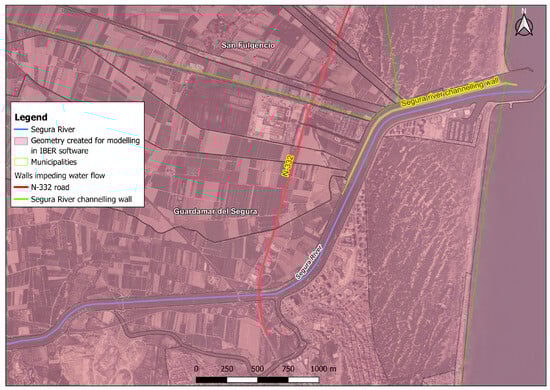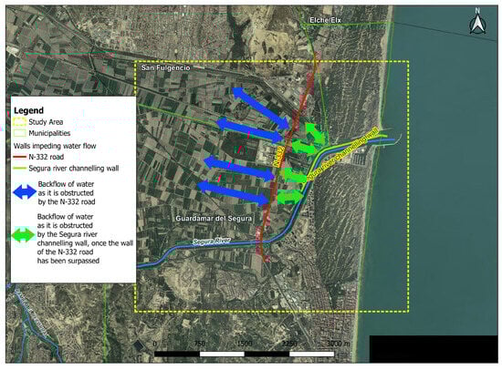 This approach has been applied, as an example, to a study area corresponding to the final stretch of the Segura River, where the presence of the N-332 road, which acts as a dam, prevents the natural flow of overflowing water and where the channelling wall of the Segura river occurs. This causes the floods to increase in depth, generating regressive flooding and worsening their effects. Hydraulic infrastructures, such as channelling or the channelling of rivers, can also act as barriers or obstacles that prevent water from returning to rivers, worsening their effects and negatively affecting the population and economic activities of a territory.