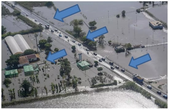23]. The flooding of a road produces two levels of consequences. On the one hand, injuries to people and the destruction of vehicles can occur. On the other hand, traffic disruption can have serious indirect consequences related to rescue and emergency services [