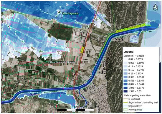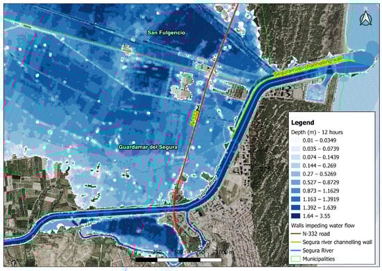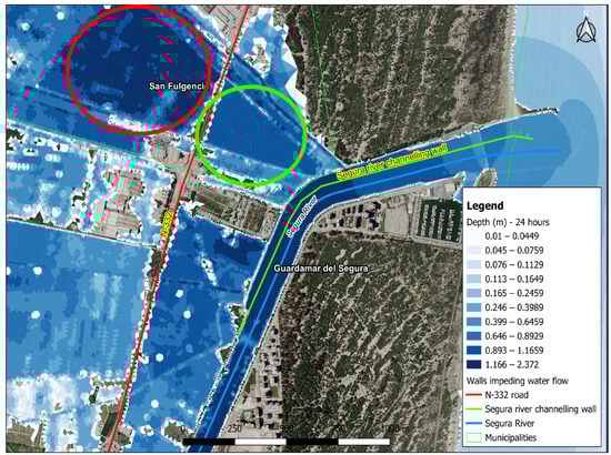 Twenty-four hours after the beginning of the simulation, the height of the water has diminished considerably in the section between the N-332 and the course of the River Segura, dropping to a height of around approximately 0.4–0.6 m. The same occurs upstream of the N-332, where the heights fall from almost 2 metres (simulation at 14 h) to 0.70 metres (simulation at 20 h) and, ultimately to 0.5–0.6 metres (simulation at 24 h) (