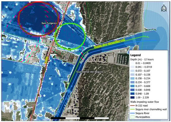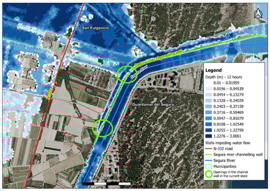 After analysing the results obtained, it is clear that the N-332 road and the wall of the Segura River channel act as walls that retain water, preventing its natural outflow and worsening the effects of flooding. For this reason, the removal of the wall of the Segura River channel that separates the old channel from the new channel is proposed, creating a single channel.
