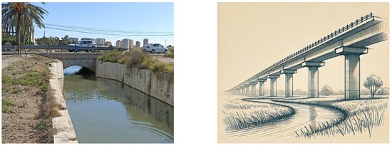 Finally, a sketch has been drawn manually of the proposal to elevate the N-332 road. In order to obtain a digitalised drawing of the manual sketch of the possible future proposal, the artificial intelligence tool ChatGPT has been used. Below is a photograph of the current state of the road, in which we can clearly observe its layout at ground level acting as a barrier, and a sketch of the proposal to resolve this problem (