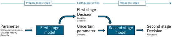 The shelters are designed for earthquakes, floods, hurricanes, and other disasters. Earthquakes are a major hazard that frequently happen in Japan. In history, big earthquakes have resulted in massive casualties. It is forecasted that a major earthquake will strike in Tokyo in the near future [2]. Except Japan, other areas also face the threat of an earthquake. In 2023, the Kahramanmaraş earthquake that hit Turkey and Syria killed more than 53,000 people and forced 2 million people to become evacuees. To reduce the possible losing of life and property, it is necessary to make sure that all people can arrive at shelters as soon as possible. In Tokyo Metropolitan, the government usually appoints elementary schools, middle schools, and other public buildings as official shelters. According to the disaster mitigation plan, these shelters are able to accept most people in need under usual emergency conditions. However, if the previously mentioned major earthquake happens, existing shelters cannot accept all evacuees as before due to the increased scale of the disaster and the resulting surge in evacuation demand. The task is to select the optimal locations from many potential locations and decide the adequate capacity for each selected shelter. The main challenge lies in uncertain demand, which means that the number of residents who are in need of shelters is unknown before making decisions. The most common way is by applying the stochastic programming that assumes that the probability distribution of uncertain demand is known. Another challenge is to handle the relationship between efficiency and cost. In order to deal with it, multi-objective optimization models that set distance or construction cost as the objectives were proposed in past research. However, it is hard to obtain the true probability distribution of uncertain demands, and unlike the emergency logistics optimization problem [3,4], in which transportation costs for delivering relief supplies and construction costs can be directly combined into a single monetary objective, the shelter location allocation problem involves the transportation of people. In this context, distances cannot be easily quantified in monetary terms and thus cannot be directly aggregated with the construction or operational costs from the first stage.