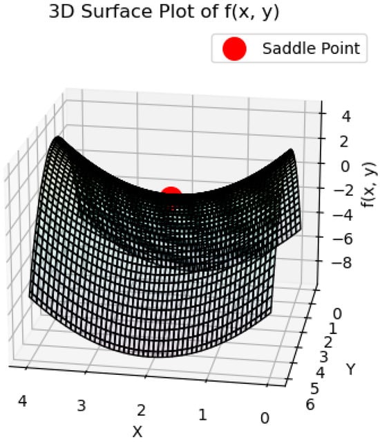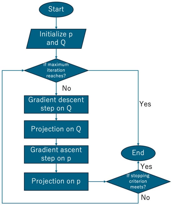 Equations (29) and (30) are the standard min–max form; therefore, we have transformed the scenario-based DRO into a saddle point problem [39]. An example of a saddle point can be seen in Figure 2. To solve this problem, we use the primal–dual hybrid gradient (PDHG) method, which alternates between minimizing the objective with respect to one variable and maximizing with respect to another, using gradient updates in each step. The Figure 3 shows the steps for solving f2, similar for f3.