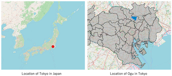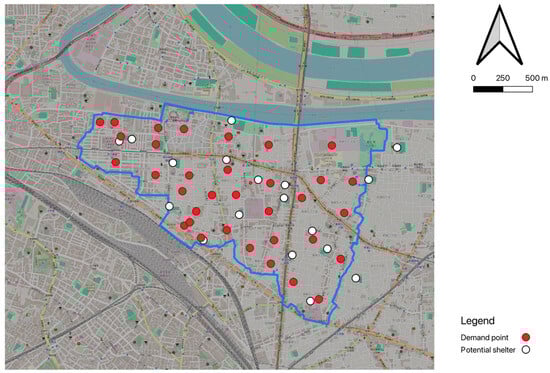 The Ogu area, situated in the northeast of Tokyo Metropolitan, spans a total area of 2.7 km2 with a population of 54,650 (as of November 2023). The location of this area is shown in Figure 4. The geology of this area is believed to consist of diluvial layers in the upland areas and alluvial layers in the lowland areas. This region is characterized by a large number of wooden structure buildings, rendering it vulnerable to both earthquakes and fires. According to the Ninth Community Earthquake Risk Assessment Study [41], approximately half of the communities in the Ogu area receive the highest risk ratings for both building collapse and fire hazards. The last major earthquake that happened in this region was the 1923 Great Kanto earthquake, which caused approximately 140,000 deaths and missing persons in the whole Kanto area. Regarding building damage, approximately 109,000 buildings were completely destroyed, and about 212,000 were completely burned down. Within this area, there are 34 demand points and 18 potential shelter locations (schools and other public buildings), which can be seen in Figure 5. Each demand point represents an administrative unit called Chōnaikai, comprising one or several communities. In Tokyo, the Chōnaikai is responsible for establishing and managing shelters, as well as stockpiling disaster relief supplies; therefore we choose it as the basic unit for allocation. In order to prepare for the possible major earthquake and the secondary earthquake, especially the fire spread, the Tokyo Metropolitan government has implemented a series of measures, including the construction of shelters. There are three types of shelters in Tokyo, which are temporary evacuation areas, evacuation area, and evacuation centers. The temporary evacuation areas consist of street parks, which are used for immediate evacuation right after earthquakes. The evacuation areas are large open spaces, like the university. It is fire-proof, which can protect evacuees from fire spread, which is very necessary, since Tokyo has many wooden buildings that are easily caught on fire. Finally, elementary schools and middle schools and other public buildings are appointed as evacuation centers, which can provide food and accommodations for evacuees. In this study, we discuss the evacuation centers.