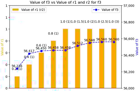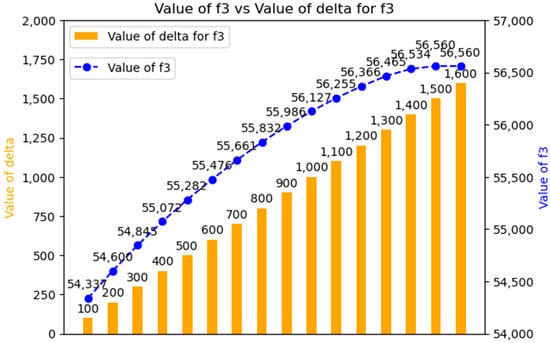 Sensitivity analysis of the ambiguity set size is conducted. All the parameters except for the one under analysis are fixed. Since we want to see the impact on the DRO model, we test the influence of the parameter on the DRO solution for f3. A big size ambiguity set means that there will be more choice of probability distribution; however, it also means that it is possible to choose the probability distribution that is “far” away from the “true” distribution. Therefore, it is necessary to see the effect of enlarging the size of the ambiguity set. To verify the impact of the size of the ambiguity set on the DRO solution, we conducted a sensitivity analysis of the size of both the moment-based set and distance-based set. For the size of the distance-based set, we set the threshold δ range from 100 to 2000 and observed the value of f3. Figure 6 shows the impact of different δ on the value of f3: it can be seen that the value of f3 increases as the size of the distance-based set increases; this is because there will be more choice for a “worse” distribution. After δ reaches around 1400, it will not change at all; this is because, when δ is big enough, we have already found the worst distribution. For the moment-based set, we set the r1 from 0.2 to 1.0 and r2 from 1.0 to 3.0. We can see from Figure 7 that the value of f3 also increases with the enlargement of the ambiguity set, and after r1 reaches around 0.8, it will never increase if r2 remains the same. When fixed r1 while r2 increases, the value of f3 will continue to increase until the maximum value is obtained. The maximum value is the same as the one obtained by the distance-based set. However, comparing these two sets, we can find that the distance-based set will show a broader range.