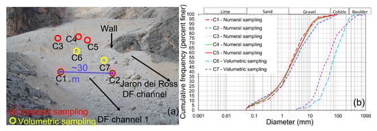 - Bunte, K.; Abt, S.R. Sampling Surface and Subsurface Particle-Size Distributions in Wadable Gravel-and Cobble-Bed Streams for Analyses in Sediment Transport, Hydraulics, and Streambed Monitoring; General Technical Report RMRS-GTR-74; US Department of Agriculture, Forest Service, Rocky Mountain Research Station: Fort Collins, CO, USA, 2001. [Google Scholar]