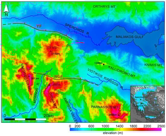 To the north, the YF delineates the steep slopes of Iti Mt, which borders the Sperchios Valley to the south, featuring several fault scarps depicted on geological maps [3,4]. This fault is also linked to the region’s geothermal activity, including the Ypati thermal springs [5]. In contrast, the NGF is less well-documented, with only small-scale fault surfaces indicated on geological maps and morphotectonic descriptions [6].