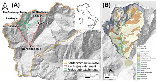 (A) The Rio Frejus catchment and sub-catchments located in the Bardonecchia municipality (orange border). (B) The Rio Frejus synthetic geological map.