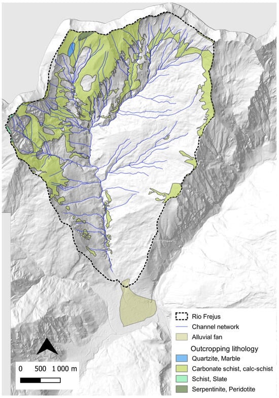 The catchment is characterized by geological settings with high structural complexity, typical of the Western Alps. The ‘Lago Nero’ represents the main tectonostratigraphic unit of the outcropping bedrock []. This unit is primarily formed by carbonate schists rich in phyllosilicates with poor geomechanical characteristics that promote a continuous production of loose material, along with subordinate serpentinites and metabasites (Figure 1B) characterized by stronger geomechanical properties.